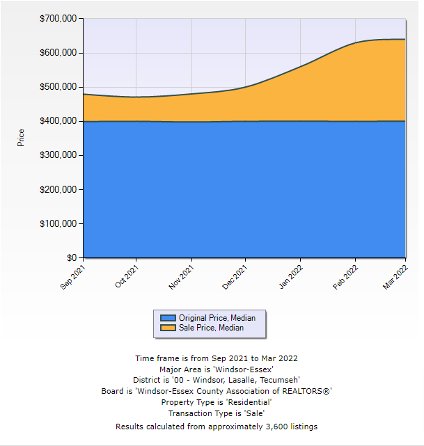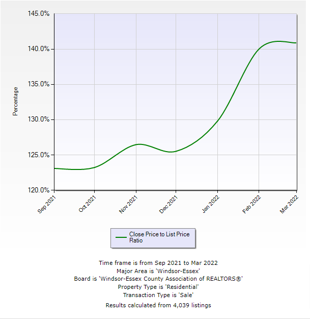 Below is a graph pulled from data in the WECAR system, showcasing information based on the following criteria – which is general in definition: Area (Windsor Essex County), Transaction Type (Sale, Residential), Timeframe (September 2021 – March 2022). Pretty general but will give a good barometer of what’s happening. Photo 1 – List Price vs Sale Price; Photo 2 – Sale Price vs List Price Ratios.